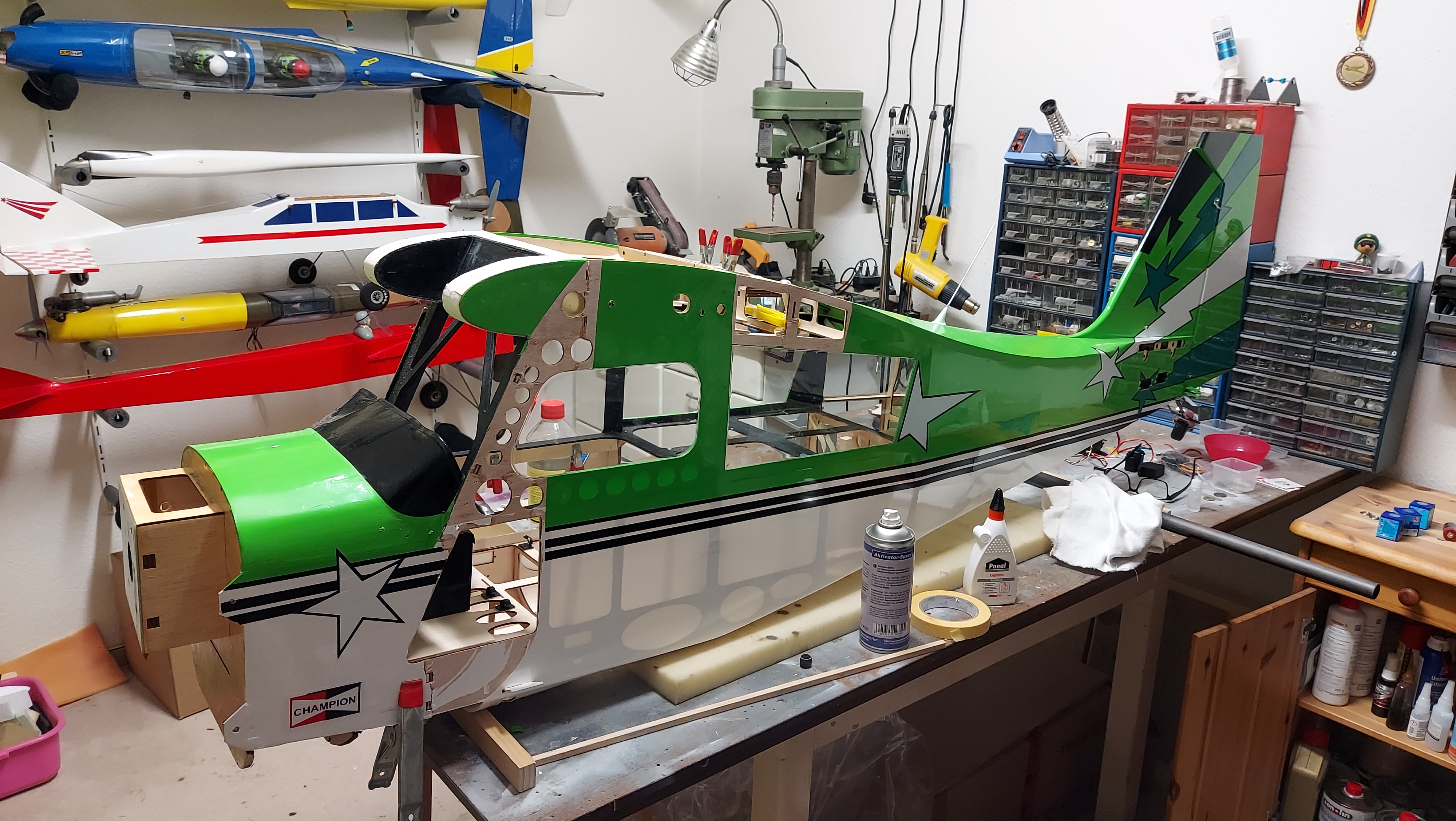 ... und so sieht das Ganze dann fast fertig aus ! 3,10 m Spannweite, 12,5 KG Fluggewicht und ca. 4 KW Leistung. Das ergibt eine sehr vorteilhafte Flächenbelastung und ein gutes Leistungsgewicht. Flächenbelastung ist gemeinsam mit dem Leistungsgewicht das Maß der Dinge im Kunstflug.
