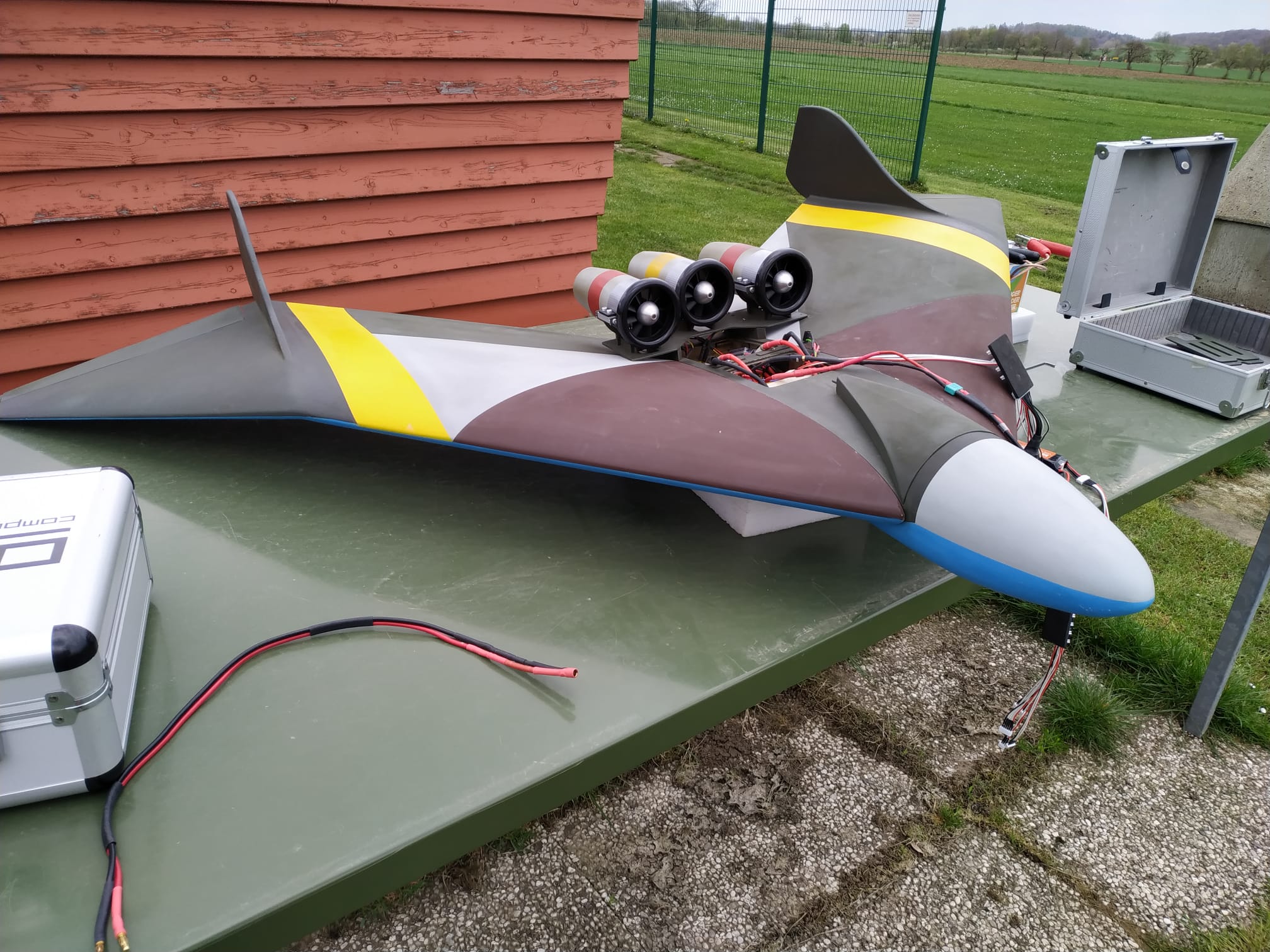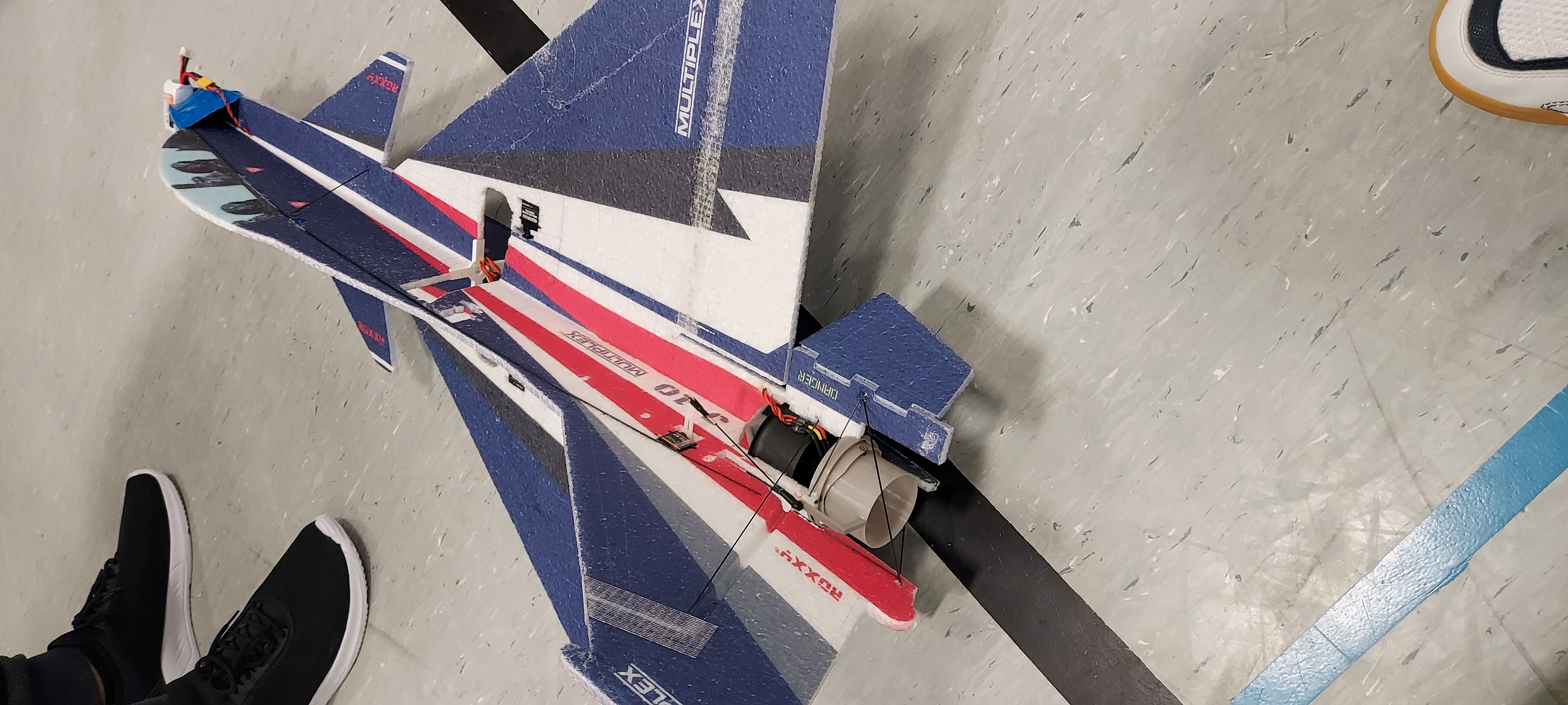 Ein Multiplex J-10 Slowflyer für die Halle. Normalerweise ausgestattet mit einem Mehrblattpropeller, mitten in der Tragfläche. Den hat Sascha herausoperiert und durch einen EDF-Vectorantrieb am Heck ersetzt. Eine vollständige Eigenkonstruktion!