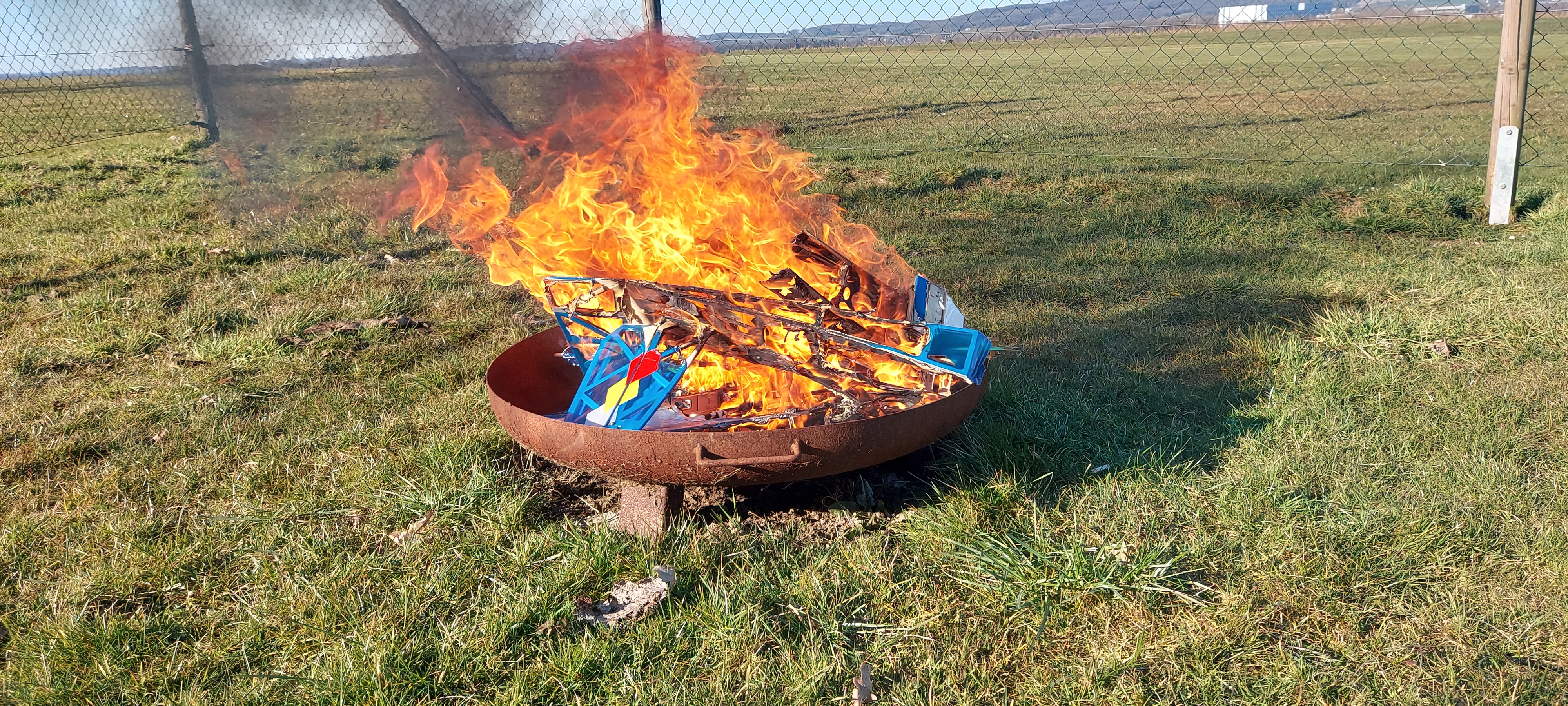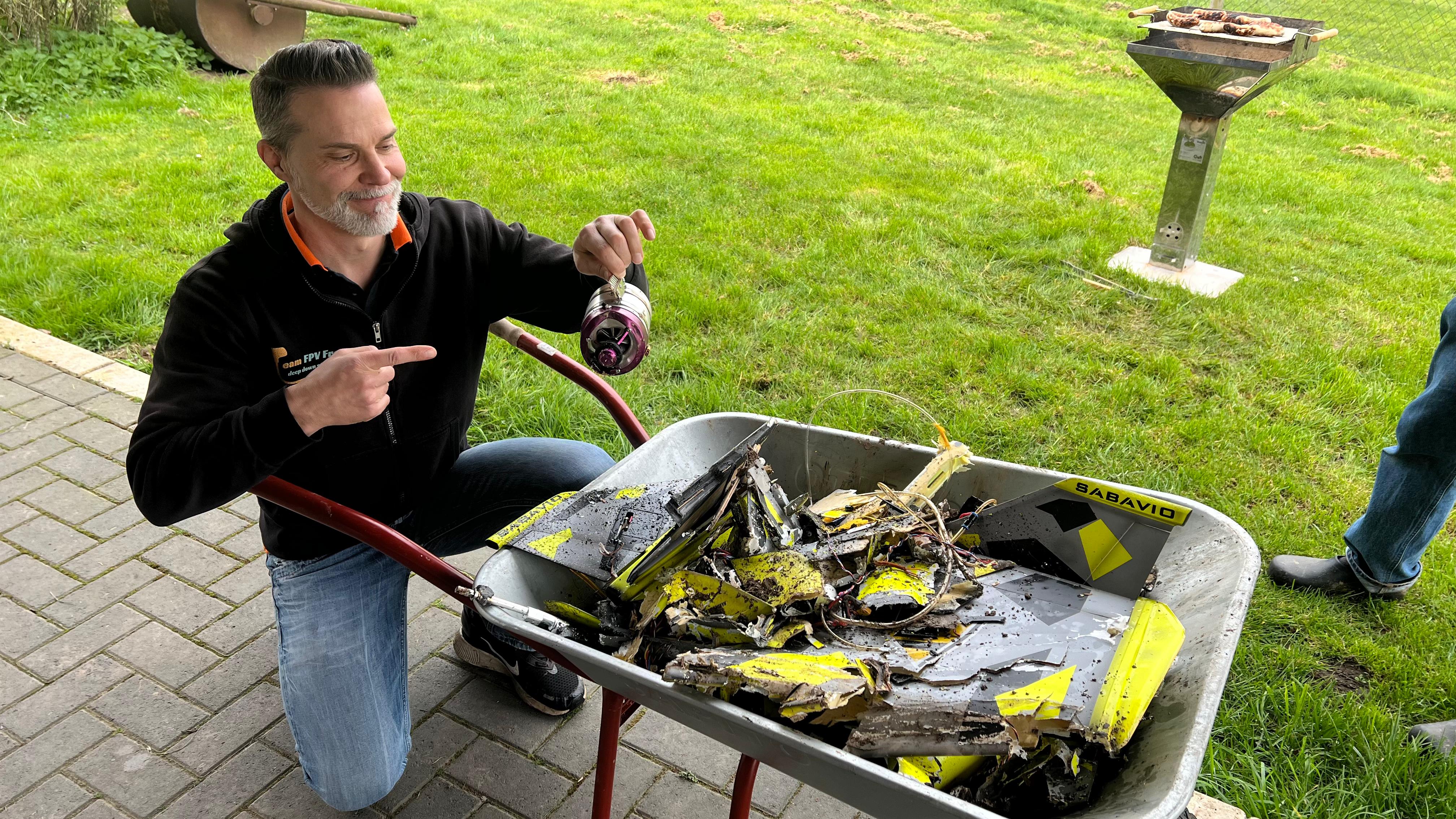 Wo wir schon bei "Pech" sind... es gibt auch die ganz traurigen Momente im Leben eines Modellfliegers. Sascha hat seine Lizzard "ausgegraben". Ein großes Turbinenmodell, welches in Platznähe eingeschlagen ist. Noch lächelt er mit den Resten seiner Turbine in der Hand. Auch wenn die Turbinen im mittleren oder hinteren Teil des Modells eingebaut sind, einen harten Einschlag überleben sie nicht.